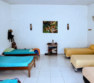 Habitación compartida con capacidad máxima para 6 personas, incluye 6 camas sencillas y ventilador.
