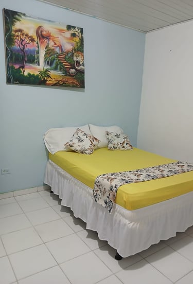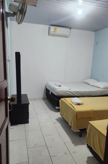 Habitación con capacidad máxima para 4 personas, consta de 1cama doble y 2 camas individuales, ventilador y baño compartido.